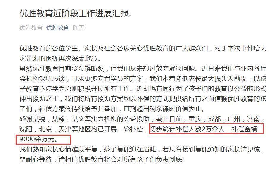 優(yōu)勝教育指出,雖然目前資金鏈斷裂,但從未想過(guò)放棄解決問(wèn)題。近日來(lái)與業(yè)內各社會(huì )機構深切懇談,尋求更多安置學(xué)員的方案,近期也有同行為了孩子們的教育以公益的形式伸出援助之手,將所有援助方案均以補償的方式提供給所有之前信賴(lài)優(yōu)勝教育的孩子們,補償方案會(huì )持續給予并疊加,直到超出剩余課時(shí)價(jià)值為止。